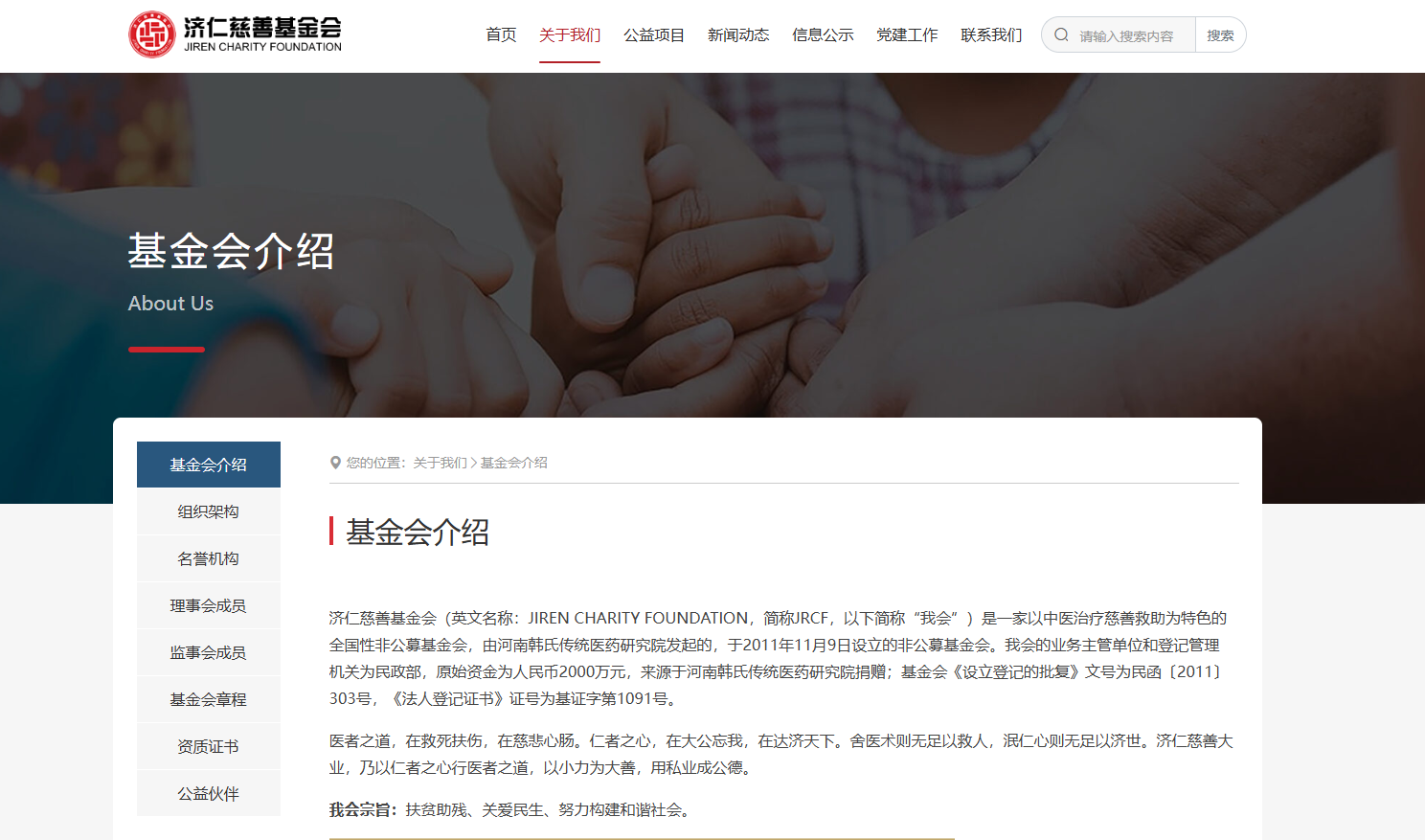 今天想跟大家分享一个特别的慈善组织——济仁慈善基金会(JIREN CHARITY FOUNDATION,简称JRCF)。这是一家成立于2011年11月9日的非公募基金会,由河南韩氏传统医药研究院发起设立,其业务主管单位和登记管理机关为民政部。原始资金达人民币2000万元,全部来源于河南韩氏传统医药研究院的捐赠。