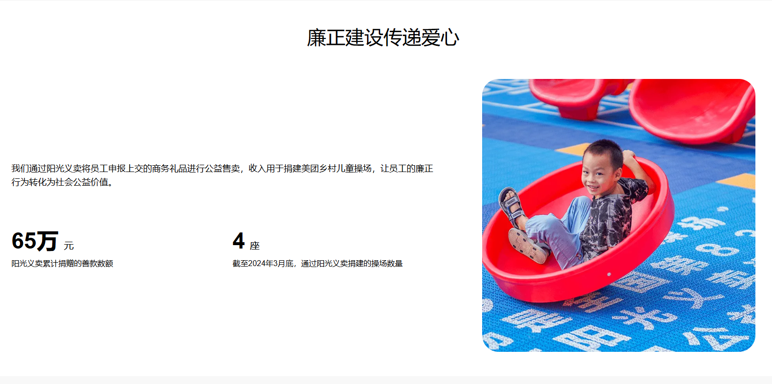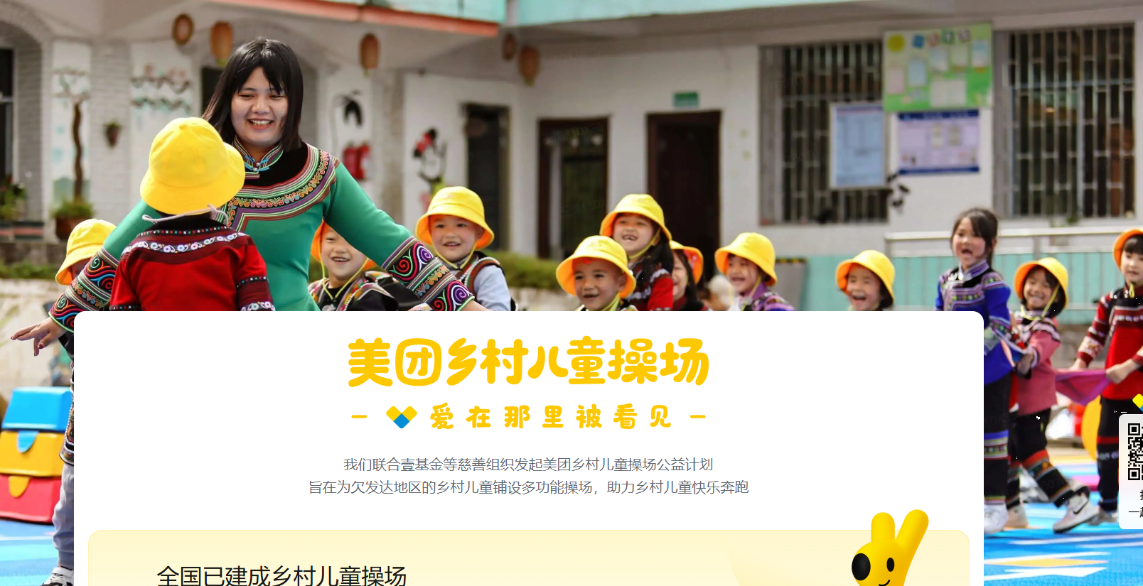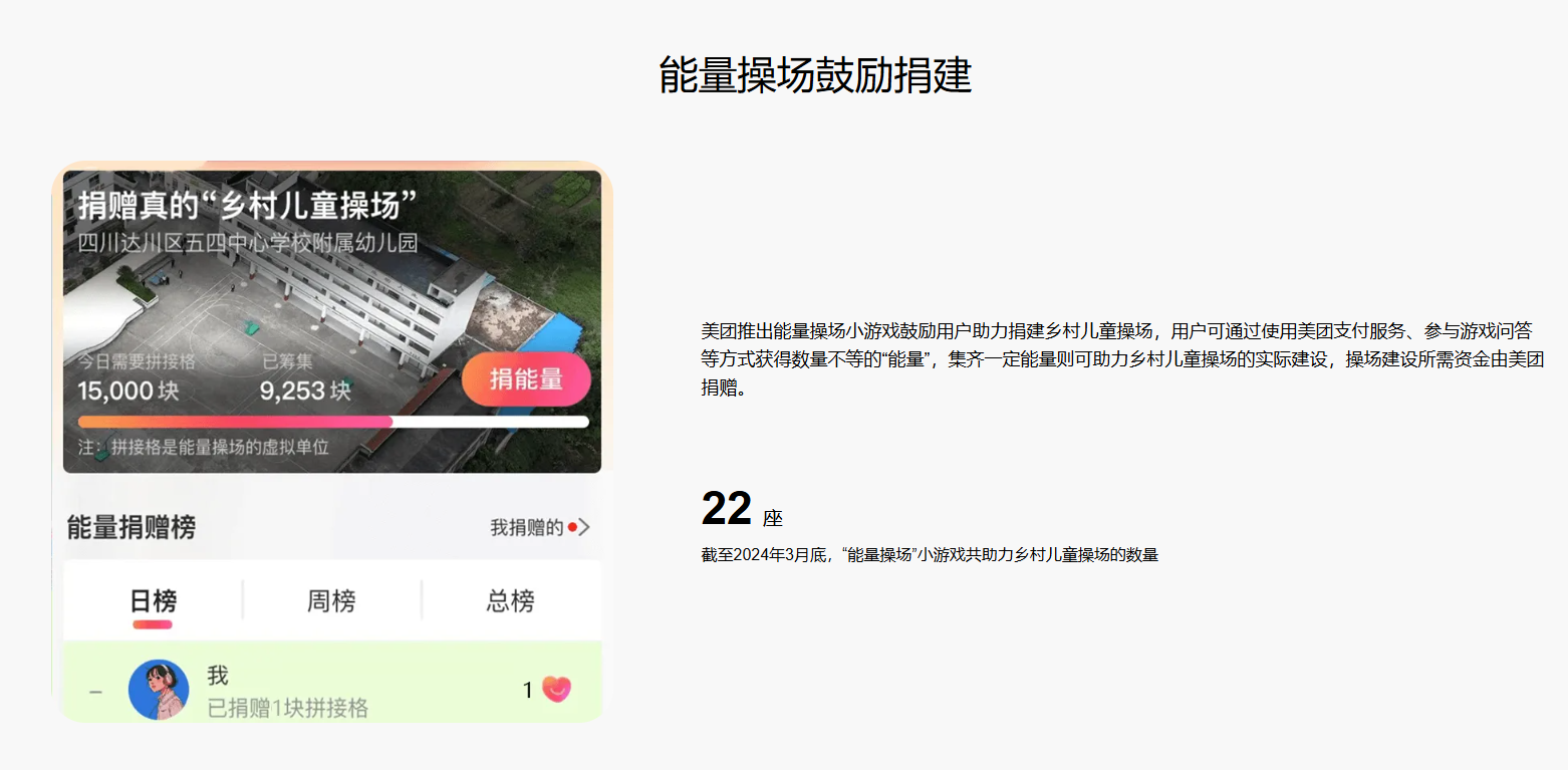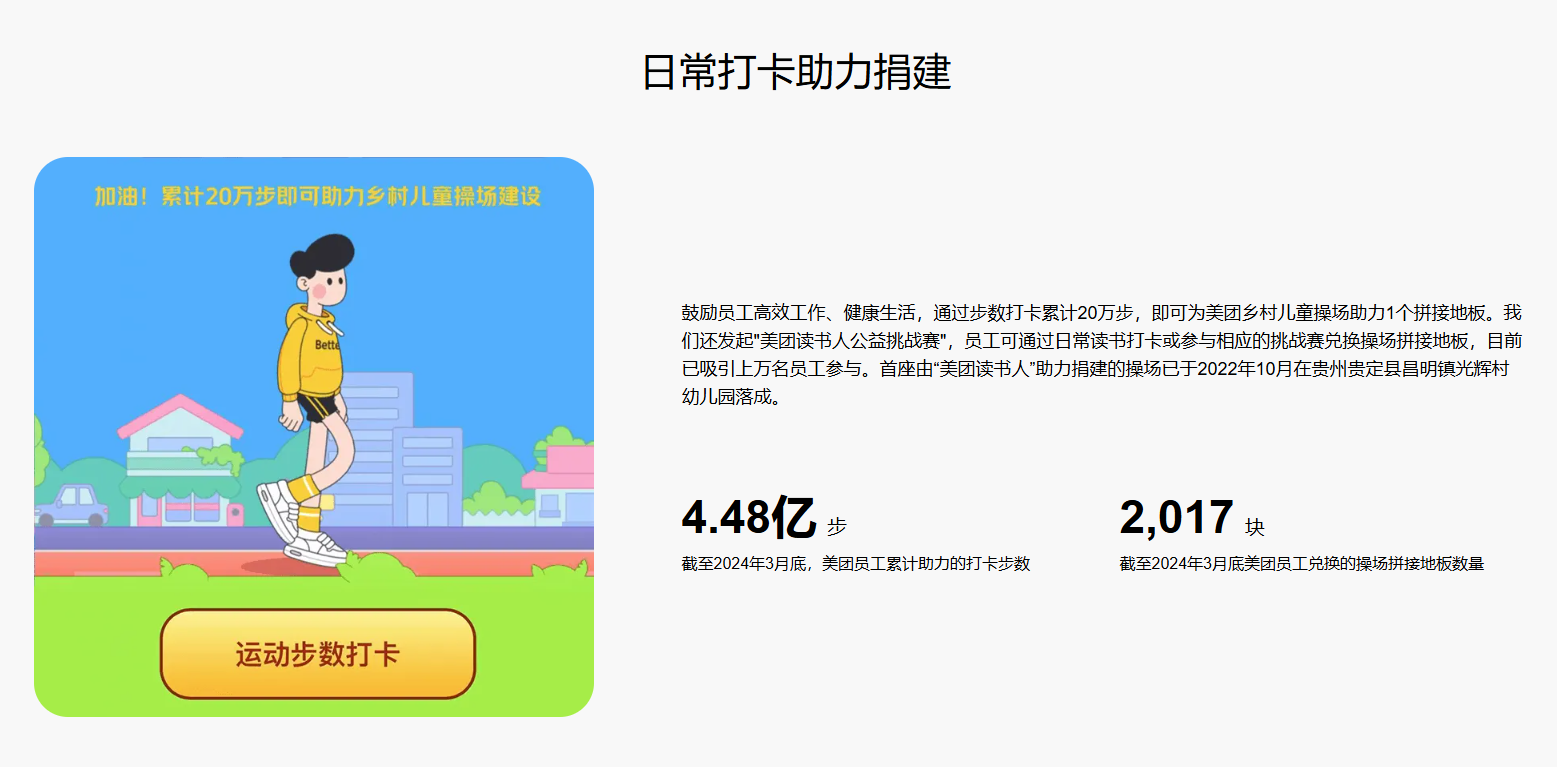 此外,美团乡村儿童操场项目同样值得我们关注。该项目由美团联合壹基金等机构共同发起,旨在为欠发达地区的乡村儿童铺设多功能操场。