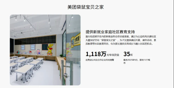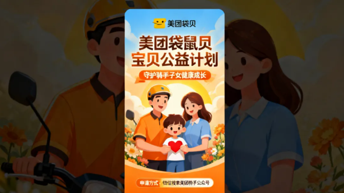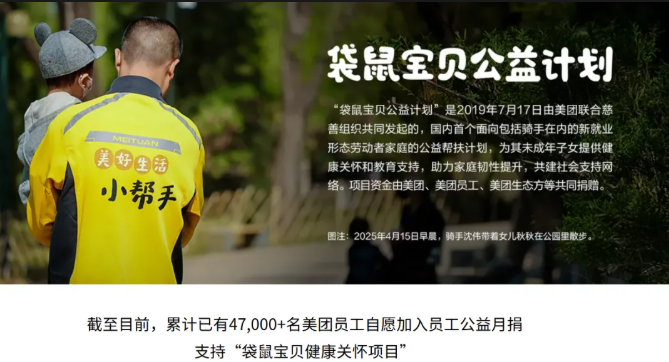 2019 年启动的美团袋鼠宝贝公益计划,始终致力于为全行业外卖骑手子女撑起 “保护伞”。