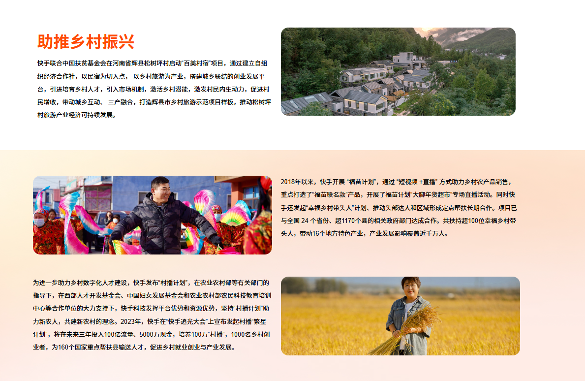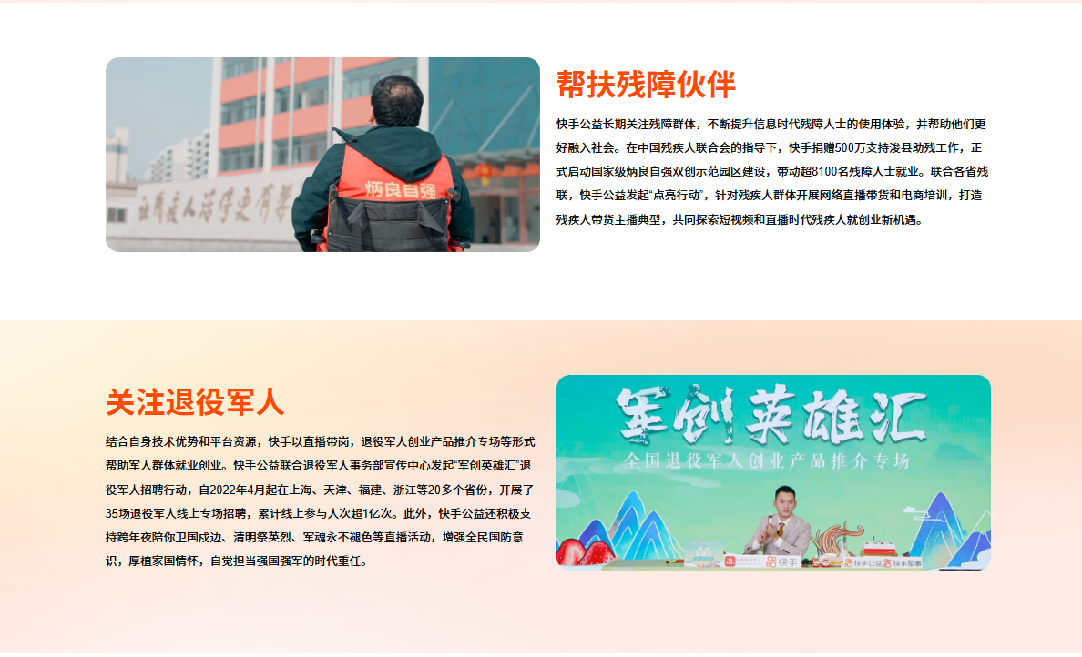 此外,快手基金会还在青少年保护、文化传承、乡村振兴、支持女性发展、银龄关爱、帮扶残障伙伴、关注退役军人以及助力环保公益等方面做出了巨大贡献。