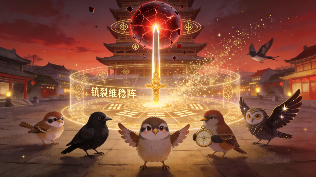 剑身上的“维稳符文”逐一亮起,从剑镡到剑尖,像一条被点亮的星河。光芒流淌,注入地面金色的奇门格局。八门方位的淡金光柱升起,在中央阵眼交汇。